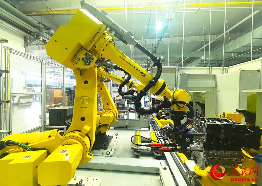 An industrial robot assembles an engine in the smart factory of Liuzhou Saike Technology Development Co., Ltd. in Liuzhou, south China's Guangxi Zhuang Autonomous Region. (People's Daily Online/Fu Huazhou)