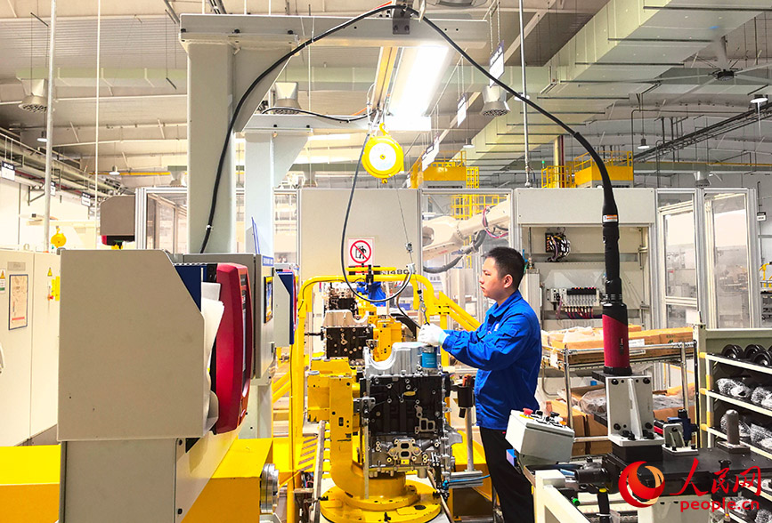Workers check engines before they roll off the production line in the smart factory of Liuzhou Saike Technology Development Co., Ltd. in Liuzhou, south China's Guangxi Zhuang Autonomous Region. (People's Daily Online/Fu Huazhou)