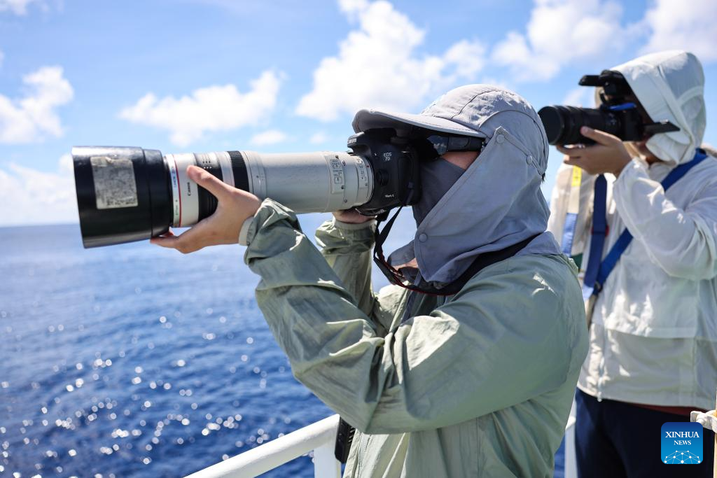 Members of a marine biodiversity expedition team take photos on deck in the waters east of Hainan Island, south China, July 5, 2024. A marine biodiversity expedition team has recently witnessed a large number of cetaceans in the waters east of Hainan Island, including short-finned pilot whales, Fraser's dolphins and rough-toothed dolphins. Among the cetacean species, many mother-child pairs have been spotted. (Xinhua/Zhang Liyun)