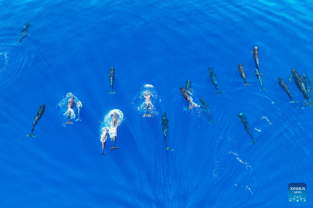 An aerial drone photo shows short-finned pilot whales swimming in the waters east of Hainan Island, south China, July 5, 2024. A marine biodiversity expedition team has recently witnessed a large number of cetaceans in the waters east of Hainan Island, including short-finned pilot whales, Fraser's dolphins and rough-toothed dolphins. Among the cetacean species, many mother-child pairs have been spotted. (Xinhua/Zhang Liyun)