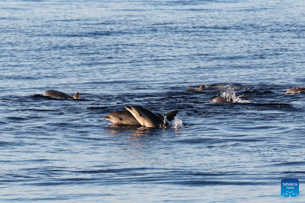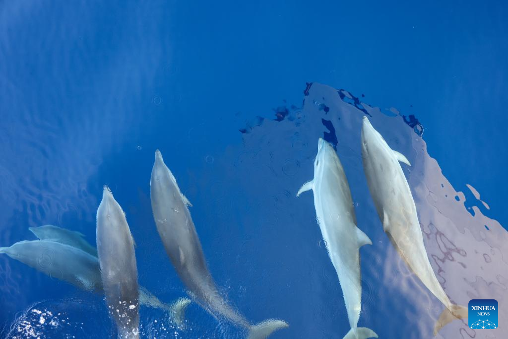 Fraser's dolphins swim in the waters east of Hainan Island, south China, July 6, 2024. A marine biodiversity expedition team has recently witnessed a large number of cetaceans in the waters east of Hainan Island, including short-finned pilot whales, Fraser's dolphins and rough-toothed dolphins. Among the cetacean species, many mother-child pairs have been spotted. (Xinhua/Zhang Liyun)