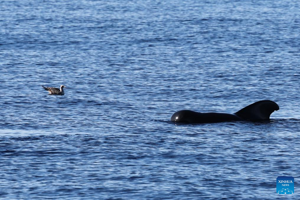A short-finned pilot whale swims in the waters east of Hainan Island, south China, July 6, 2024. A marine biodiversity expedition team has recently witnessed a large number of cetaceans in the waters east of Hainan Island, including short-finned pilot whales, Fraser's dolphins and rough-toothed dolphins. Among the cetacean species, many mother-child pairs have been spotted. (Xinhua/Zhang Liyun)