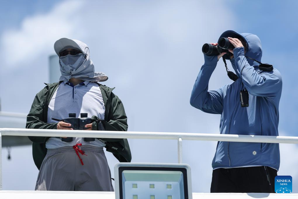 Members of a marine biodiversity expedition team observe on deck in the waters east of Hainan Island, south China, July 5, 2024. A marine biodiversity expedition team has recently witnessed a large number of cetaceans in the waters east of Hainan Island, including short-finned pilot whales, and rough-toothed dolphins. Among the cetacean species, many mother-child pairs have been spotted. (Xinhua/Zhang Liyun)