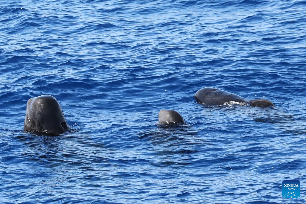 Short-finned pilot whales swim in the waters east of Hainan Island, south China, July 6, 2024. A marine biodiversity expedition team has recently witnessed a large number of cetaceans in the waters east of Hainan Island, including short-finned pilot whales, Fraser's dolphins and rough-toothed dolphins. Among the cetacean species, many mother-child pairs have been spotted. (Xinhua/Zhang Liyun)