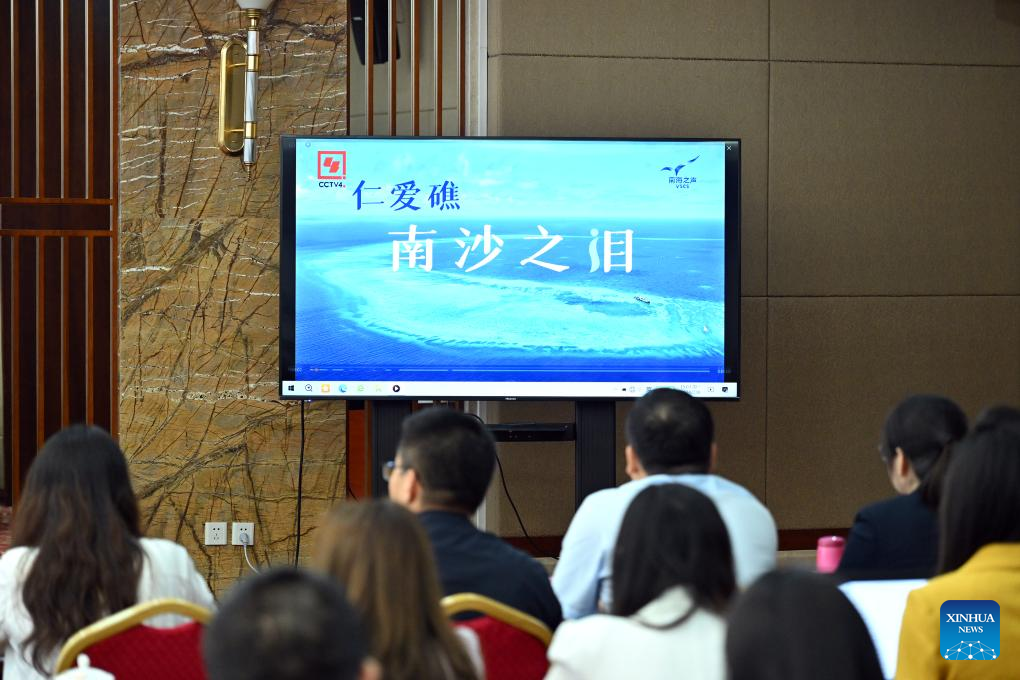 This photo taken on July 8, 2024 shows the releasing ceremony of A Survey Report on the Damage to Coral Reef Ecosystem by Illegally Grounded Military Vessel at Ren'ai Jiao in Beijing, capital of China. (Xinhua/Li Xin)