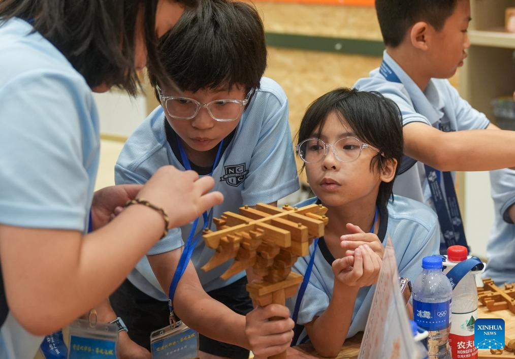 Youngsters try to assemble architecture model blocks at the China Architecture Science and Technology Museum in Wuhan, central China's Hubei Province, July 8, 2024. A group of youngsters from Hong Kong and Macao and guests participated in a study tour in Wuhan, jointly hosted by the Hubei Provincial Department of Culture and Tourism and China Construction Third Engineering Bureau Group Co., LTD. (Xinhua/Du Zixuan)