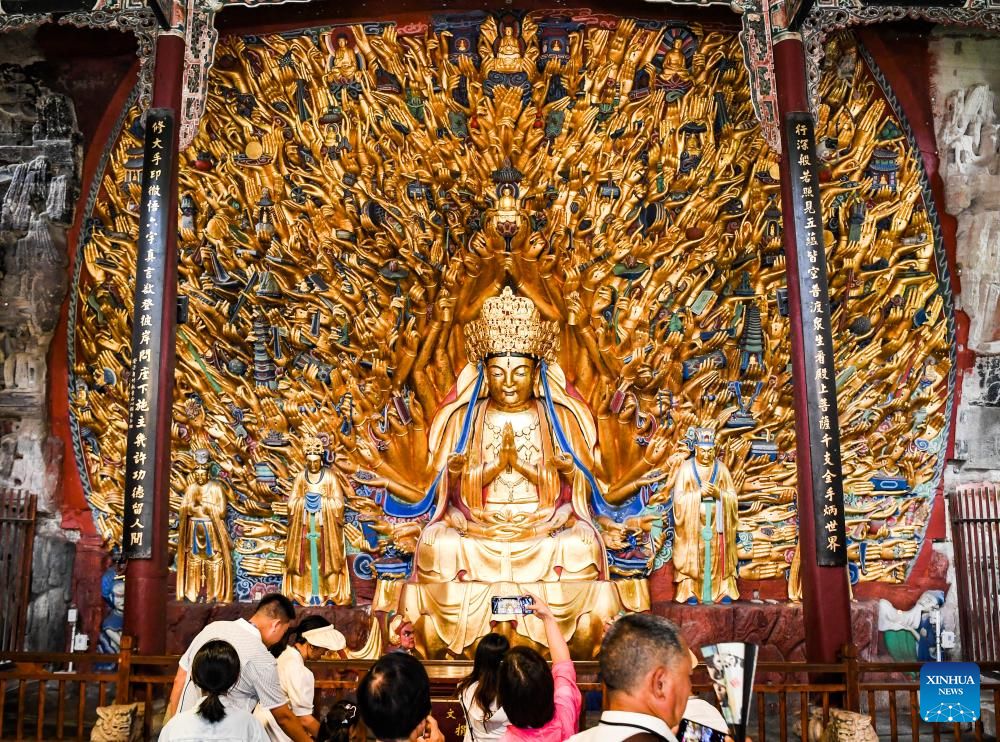 Tourists visit the scenic spot of Dazu Rock Carvings in southwest China's Chongqing, July 7, 2024. The Dazu Rock Carvings site was inscribed onto the UNESCO World Heritage List in 1999. The finest example of Chinese grotto art, the Dazu Rock Carvings site is of profound historical significance, embodying the vigorous vitality of Chinese culture. (Xinhua/Wang Quanchao)