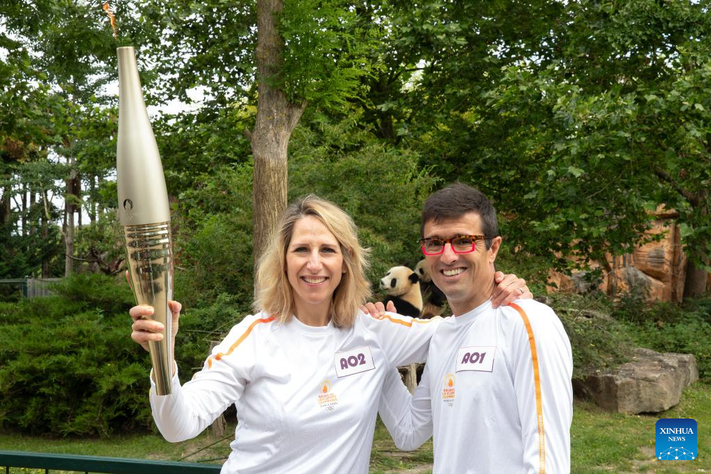 Torchbearers Rodolphe Delord (R), general director of Beauval Zoo and French navigator Maud Fontenoy pose for photos with twin giant pandas Huan Lili and Yuan Dudu behind them during the relay of the Olympic flame of Paris 2024 at Beauval Zoo in Saint-Aignan, central France, July 8, 2024. (Zoo Parc de Beauval/Handout via Xinhua)