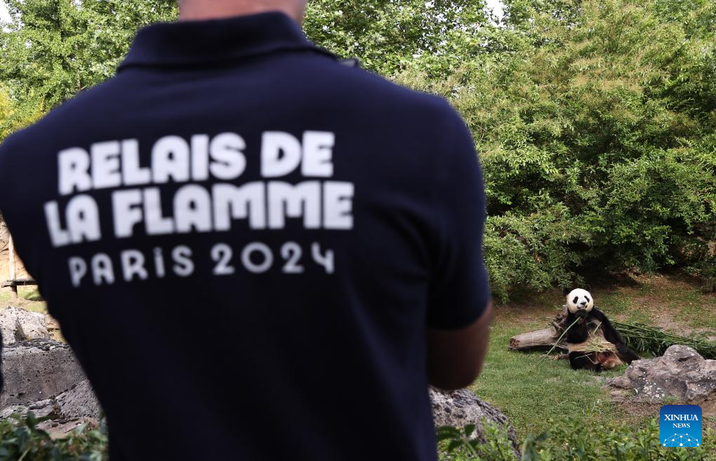 Giant panda Yuan Zai is seen before the relay of the Olympic flame of Paris 2024 at Beauval Zoo in Saint-Aignan, central France, July 8, 2024. (Xinhua/Gao Jing)