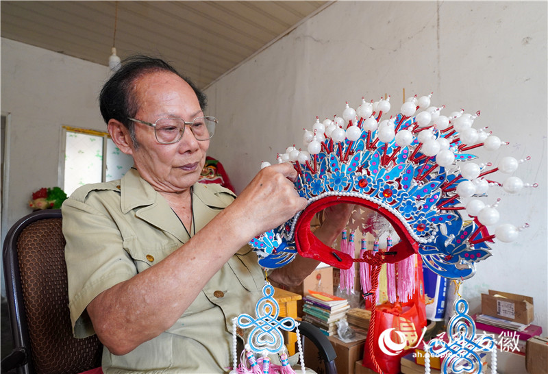 Chan Yunqiu makes an opera headdress in his living room in Shipai township, Huaining county, east China's Anhui Province. (People's Daily Online/Chen Ruotian)
