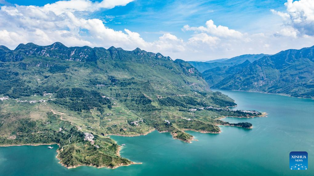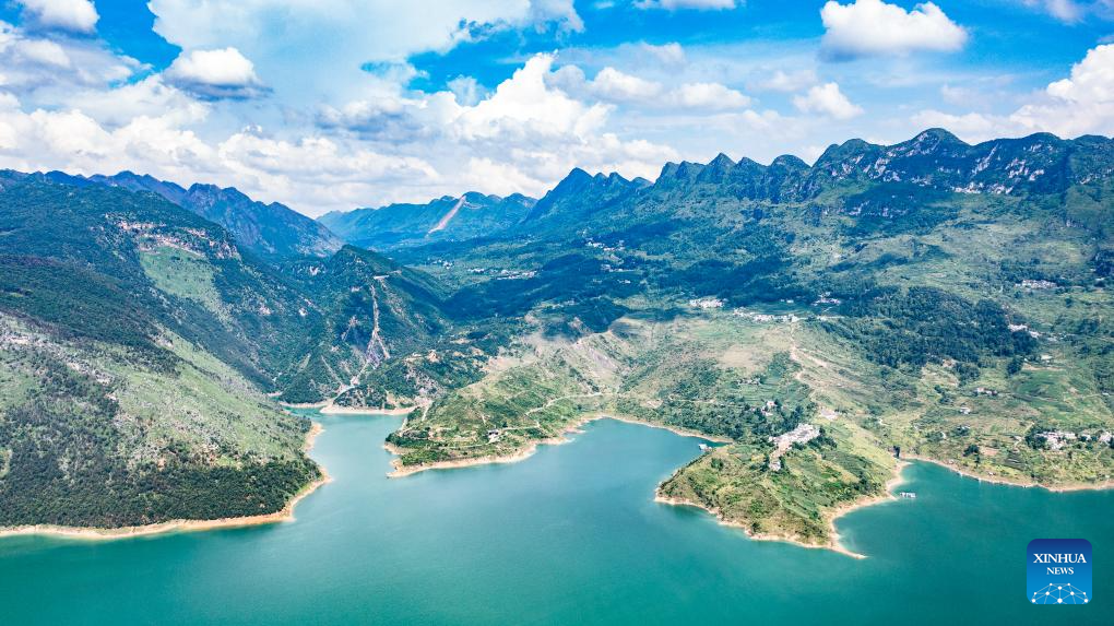 This aerial drone photo taken on July 10, 2024 shows a view of the Zangke river scenic area in Liupanshui, southwest China's Guizhou Province. (Xinhua/Tao Liang)