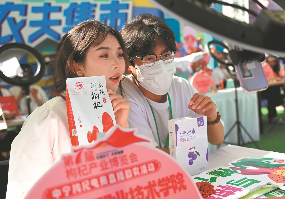 College students promote goji, or Chinese wolfberry, via livestreaming in Zhongwei, Ningxia Hui autonomous region, on June 22. (MAO ZHU/XINHUA)