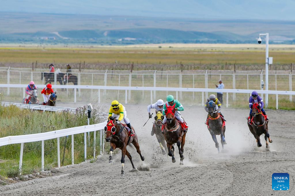 Jockeys compete during the 1,000m match of the equestrian events at the 12th National Traditional Games of Ethnic Minorities of China in Zhaosu, northwest China's Xinjiang Uygur Autonomous Region, July 10, 2024. (Xinhua/Chen Shuo)