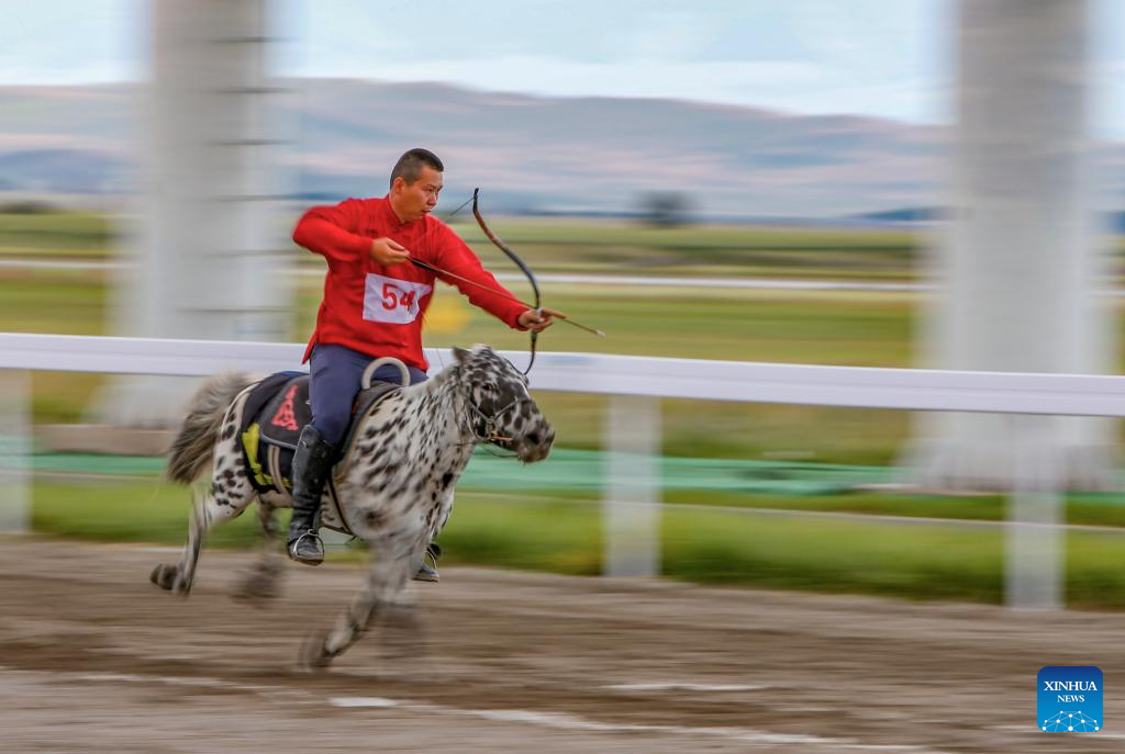 An athlete competes during the riding and archery match of the equestrian events at the 12th National Traditional Games of Ethnic Minorities of China in Zhaosu, northwest China's Xinjiang Uygur Autonomous Region, July 10, 2024. (Xinhua/Chen Shuo)