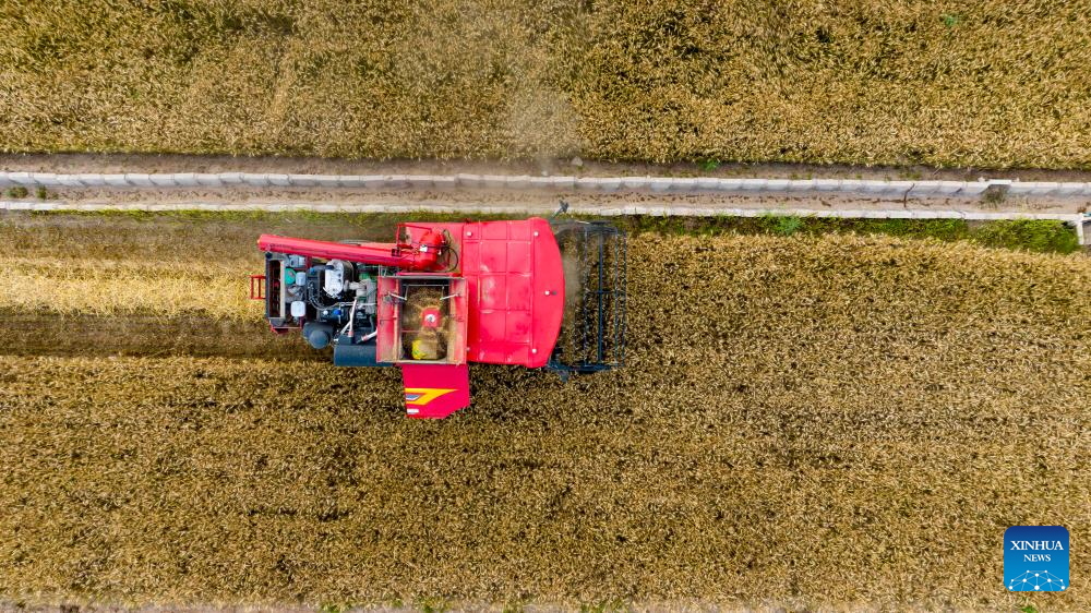 A drone photo taken on July 10, 2024 shows a reaper harvesting wheat in a field in Tongxin County of Wuzhong City, northwest China's Ningxia Hui Autonomous Region.?(Xinhua/Yang Zhisen)