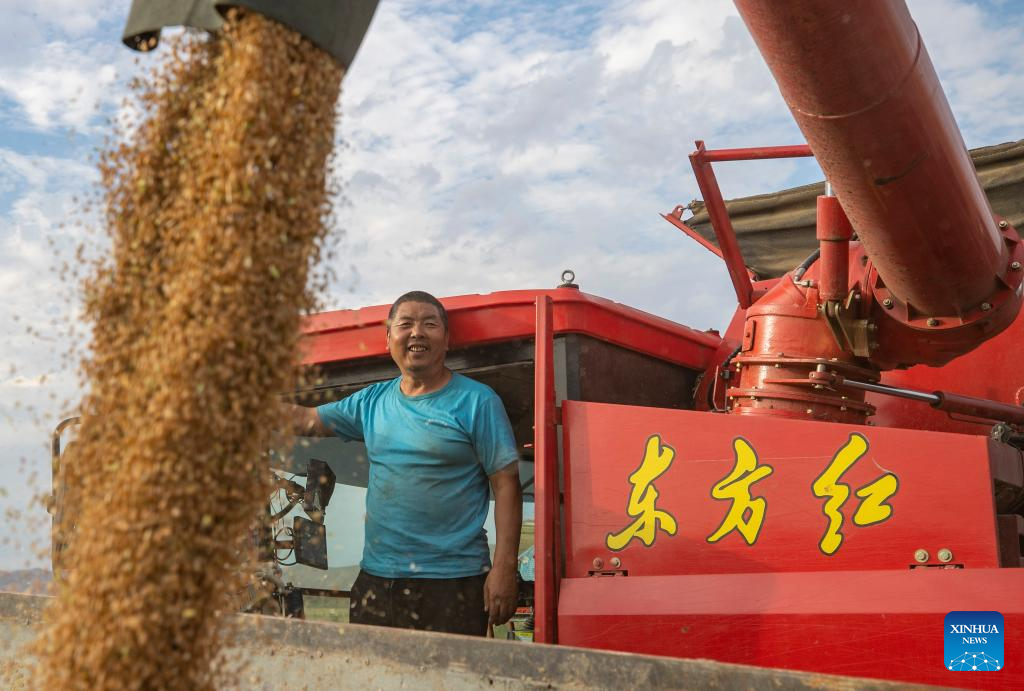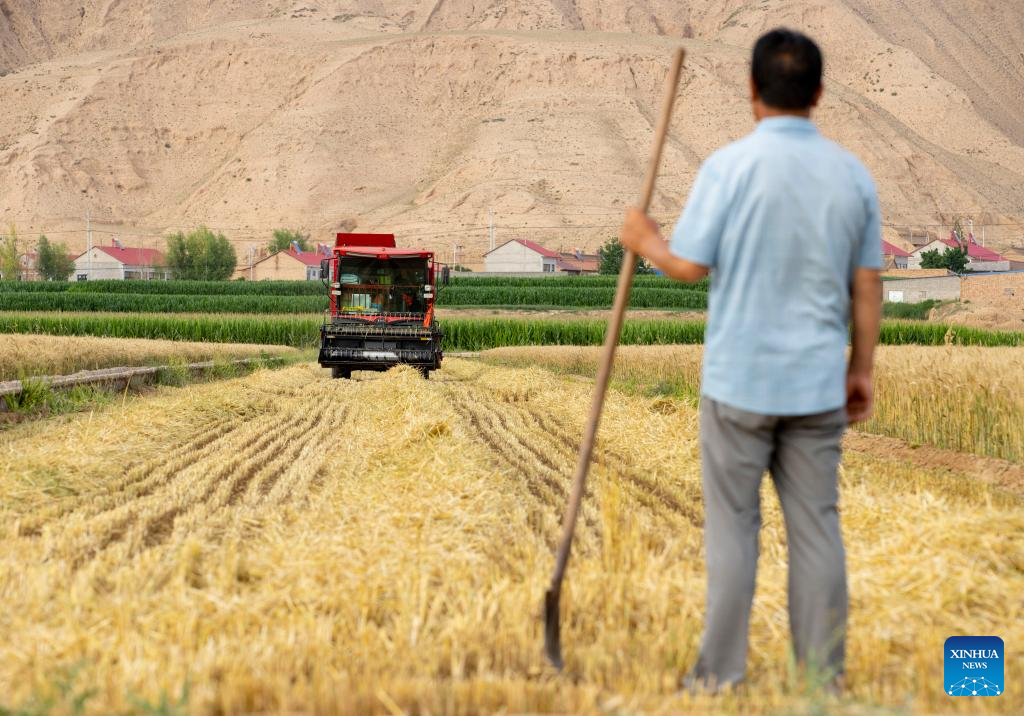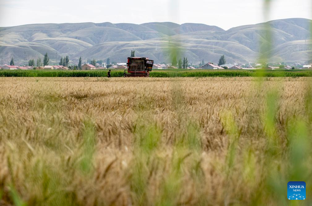 A farmer harvests wheat in a field in Tongxin County of Wuzhong City, northwest China's Ningxia Hui Autonomous Region, July 10, 2024.?(Xinhua/Yang Zhisen)