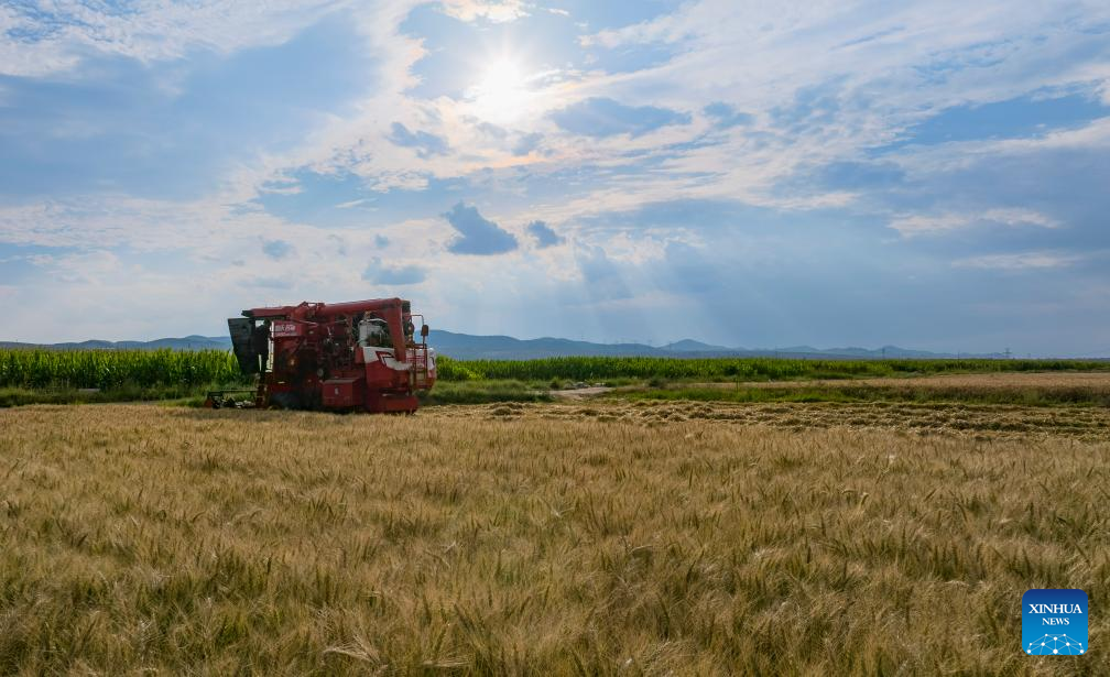 This photo taken on July 10, 2024 shows a reaper harvesting wheat in a field in Tongxin County of Wuzhong City, northwest China's Ningxia Hui Autonomous Region.?(Xinhua/Yang Zhisen)