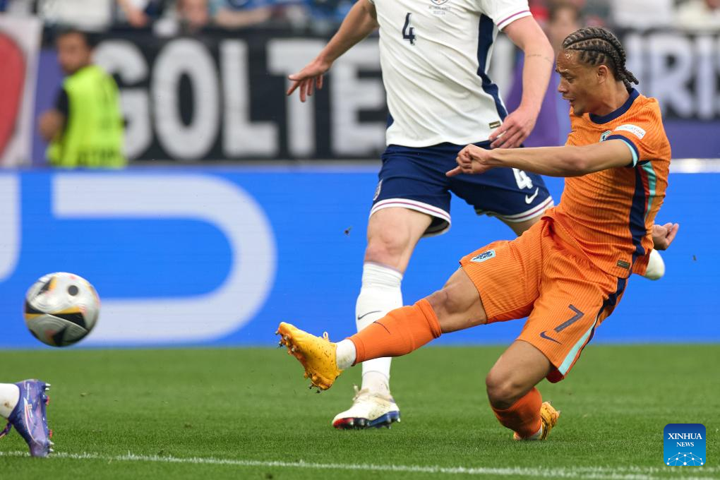 Xavi Simons of the Netherlands shoots to score during the UEFA Euro 2024 semifinal match between England and the Netherlands in Dortmund, Germany on July 10, 2024. (Xinhua/Meng Dingbo)