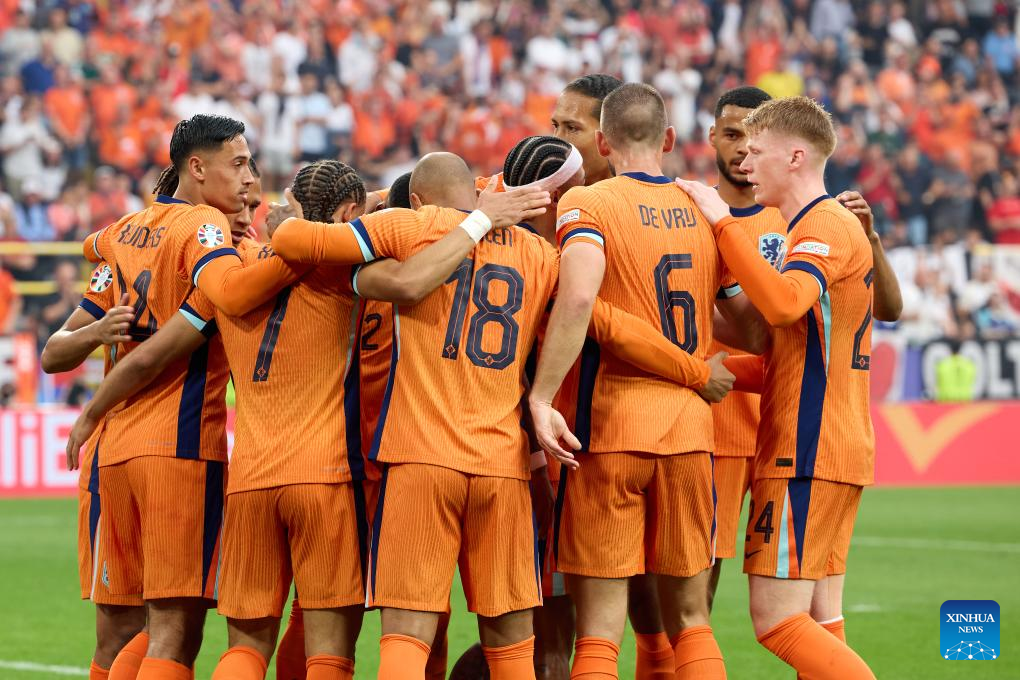 Players of the Netherlands celebrate scoring during the UEFA Euro 2024 semifinal match between England and the Netherlands in Dortmund, Germany on July 10, 2024. (Xinhua/Meng Dingbo)
