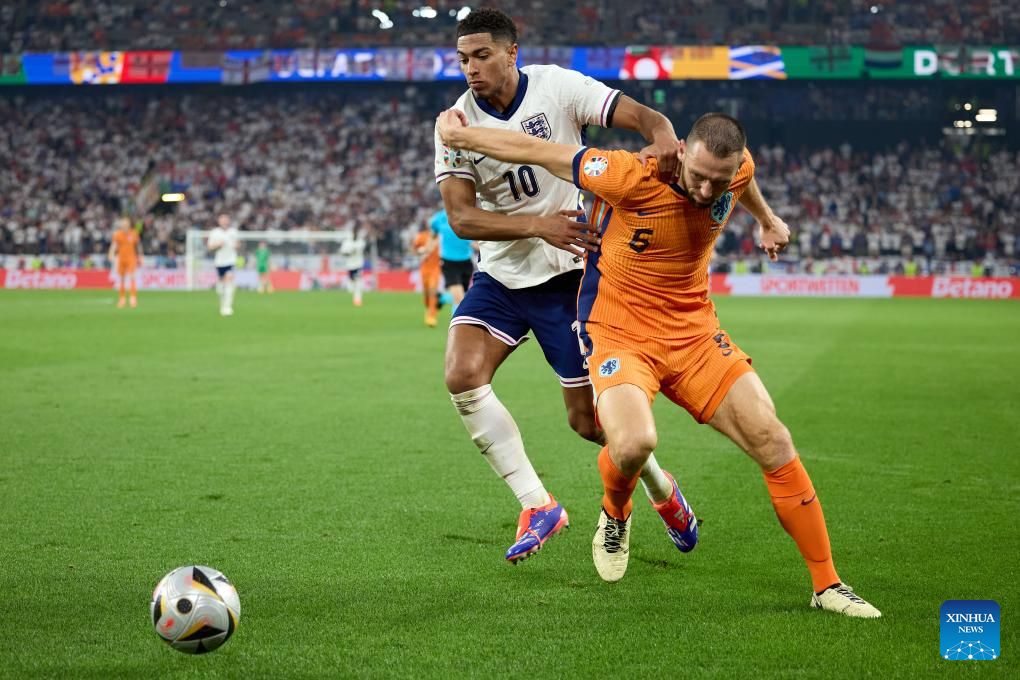 Jude Bellingham (L) of England vies with Stefan de Vrij of the Netherlands during the UEFA Euro 2024 semifinal match between England and the Netherlands in Dortmund, Germany on July 10, 2024. (Xinhua/Meng Dingbo)