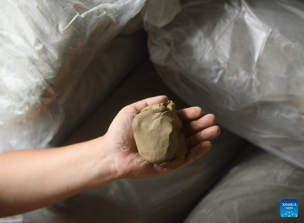 Xie Zhenwei shows the clay made from local materials for porcelain-making in Shabu Township, Huangyan of Taizhou, east China's Zhejiang Province, July 11, 2024. (Xinhua/Weng Xinyang)
