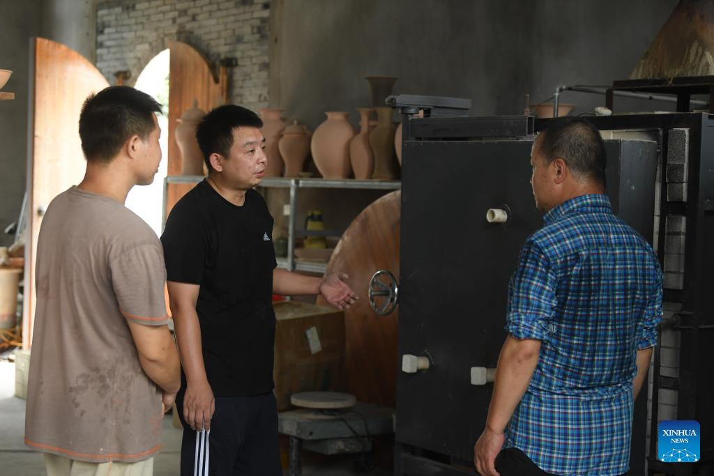 Xie Zhenwei (C) discusses with his fellows on porcelain-making in Shabu Township, Huangyan of Taizhou, east China's Zhejiang Province, July 11, 2024. (Xinhua/Weng Xinyang)