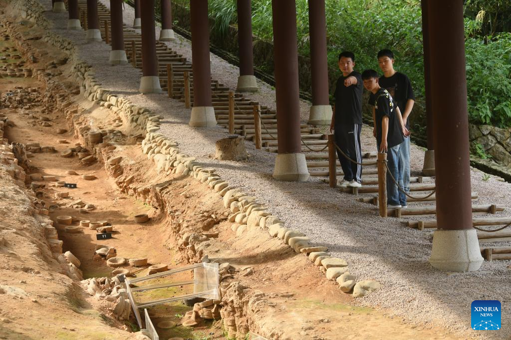 Xie Zhenwei (L) makes a point as students graduated from a technician college look on during a visit in a relic site of an ancient kiln in Shabu Township, Huangyan of Taizhou, east China's Zhejiang Province, July 11, 2024. (Xinhua/Weng Xinyang)