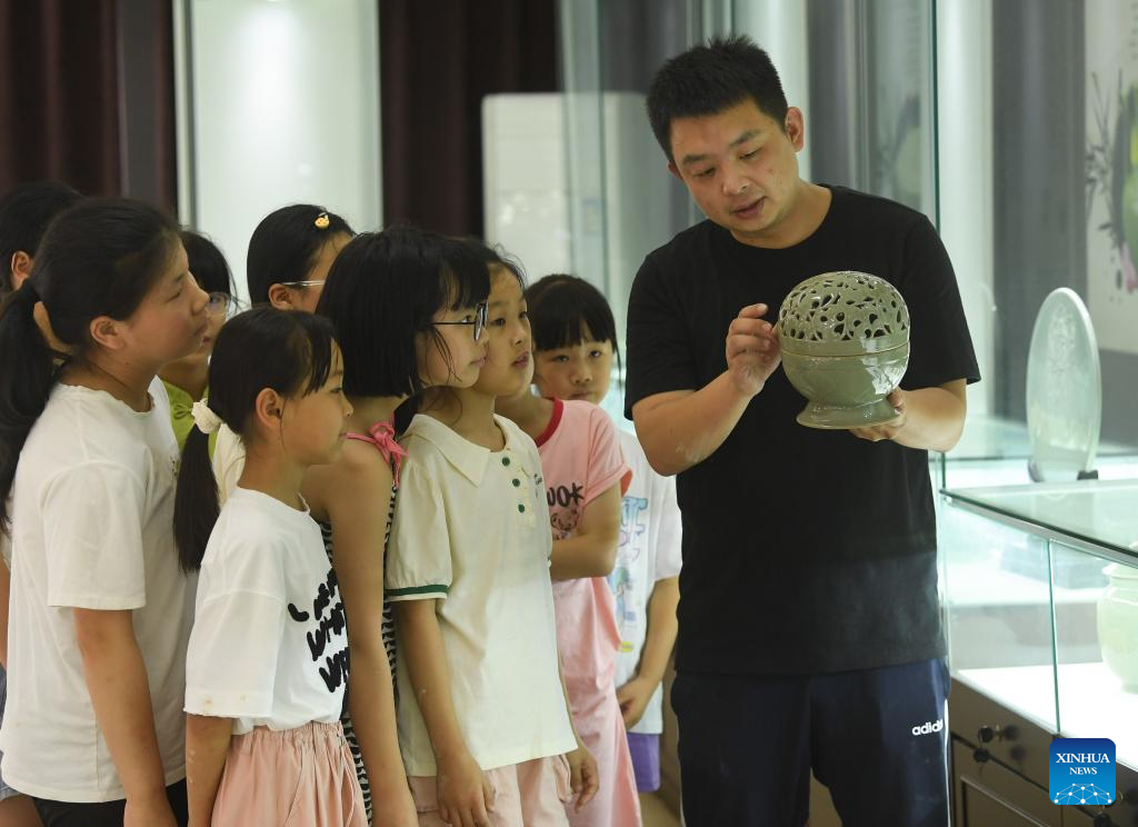 Xie Zhenwei explains the features of a Shabu-Kiln celadon censer as primary school students listen in Shabu Township, Huangyan of Taizhou, east China's Zhejiang Province, July 11, 2024. (Xinhua/Weng Xinyang)?