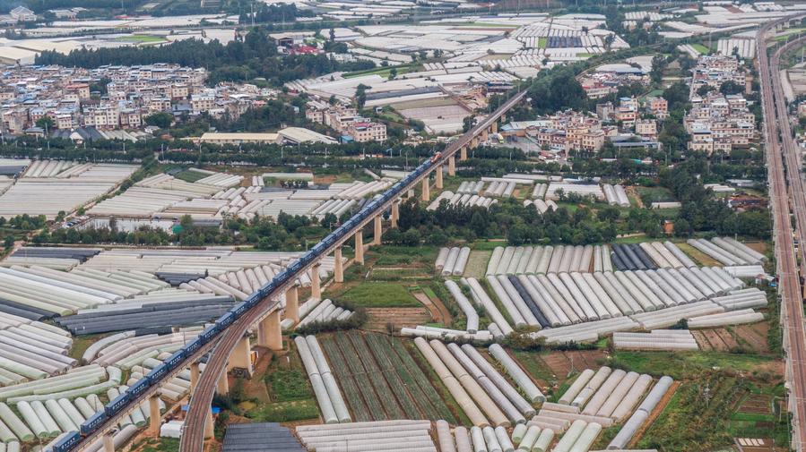 This aerial photo taken on Oct. 8, 2023 shows the 1st freight train of Shanghai-Kunming Lancang-Mekong Express leaving Wangjiaying West Station in Kunming, southwest China's Yunnan Province. (Xinhua/Hu Chao)