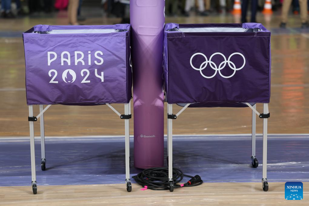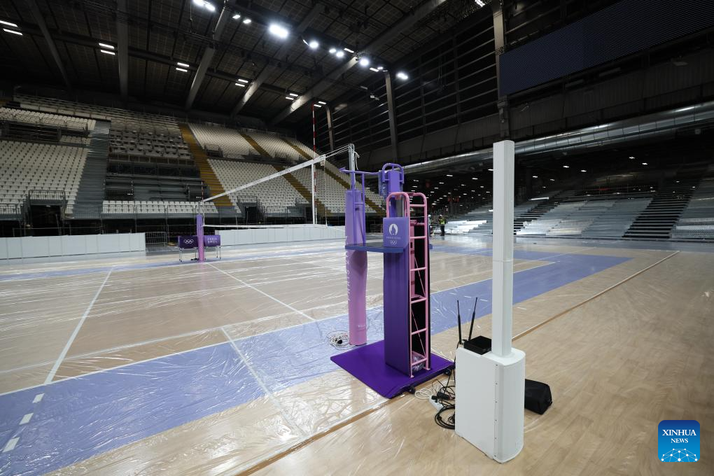 This photo taken on July 11, 2024 shows the volleyball facilities in the South Paris Arena, in Paris, France. The South Paris Arena will host sports events like weightlifting, handball, table tennis and volleyball during the Paris 2024 Olympic Games. (Photo by Julien Mattia/Xinhua)