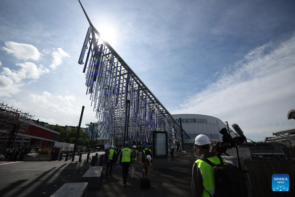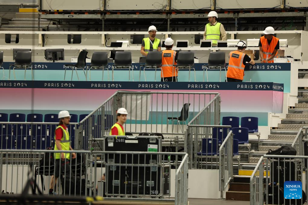 Staffs work in the South Paris Arena in Paris, France, July 11, 2024. The South Paris Arena will host sports events like weightlifting, handball, table tennis and volleyball during the Paris 2024 Olympic Games. (Photo by Julien Mattia/Xinhua)