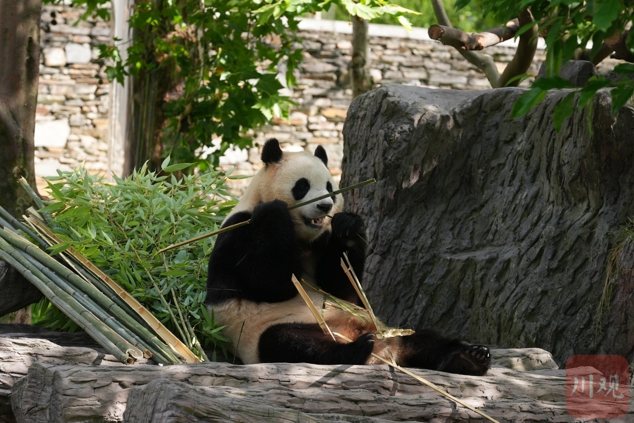 The giant panda Fu Bao eats bamboo at the Shenshuping giant panda base in Wolong National Nature Reserve, southwest China's Sichuan Province. (Photo/cbgc.scol.com.cn)