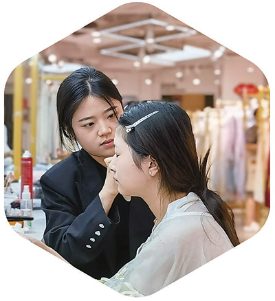 A staff member of a Hanfu experience store applies makeup on a customer at the Datang Everbright City in Xi'an, capital of northwest China's Shaanxi Province. (People's Daily/Wang Ke)