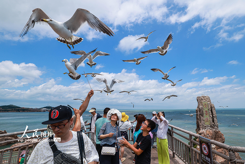 Tourists enjoy interacting with black-tailed gulls in Rongcheng, east China's Shandong Province, July 6, 2024. (vip.people.com.cn/Li Xinjun)