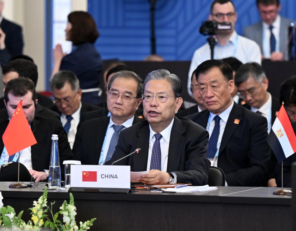 Zhao Leji, chairman of China's National People's Congress (NPC) Standing Committee, delivers a speech while attending the plenary session of the 10th BRICS Parliamentary Forum in St. Petersburg, Russia, July 11, 2024. This year's forum ran from Thursday to Friday in St. Petersburg. Zhao attended the forum here and delivered speeches at the event. (Xinhua/Liu Weibing)