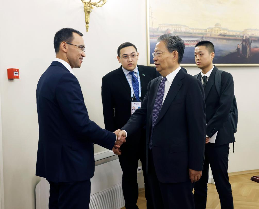 Zhao Leji, chairman of China's National People's Congress (NPC) Standing Committee, meets with Maulen Ashimbayev, Kazakhstan's Senate Chairperson, on the sideline of the 10th BRICS Parliamentary Forum in St. Petersburg, Russia, July 12, 2024. This year's forum ran from Thursday to Friday in St. Petersburg. Zhao attended the forum here and delivered speeches at the event. (Xinhua/Liu Weibing)