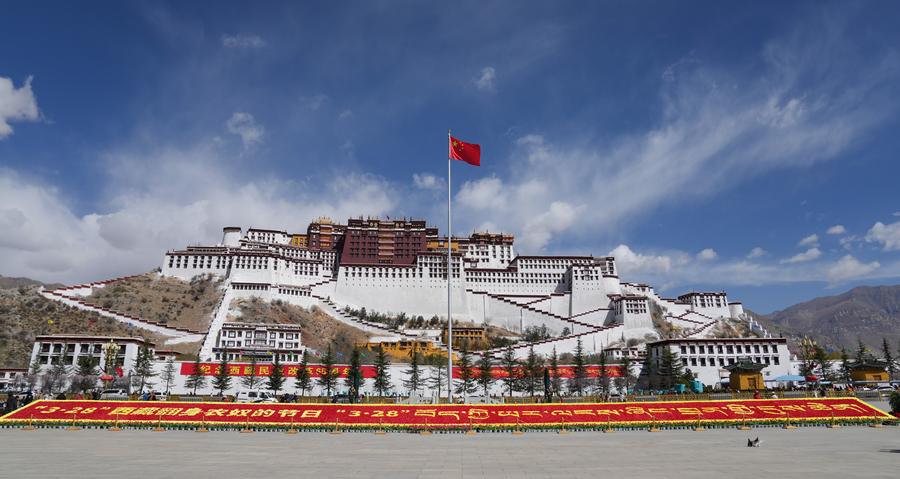 The national flag of China is seen on the square in front of the Potala Palace on the Serfs' Emancipation Day in Lhasa, capital of southwest China's Xizang Autonomous Region, March 28, 2024. (Xinhua/Jigme Dorje)