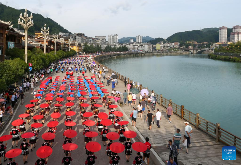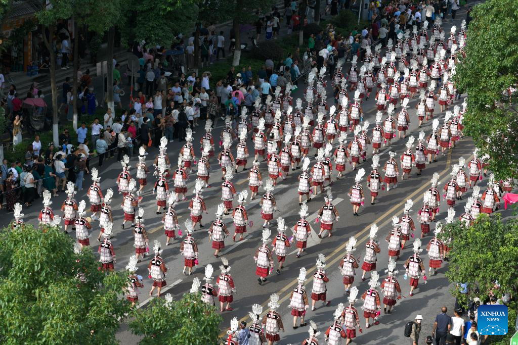People take part in the celebration of "Liuyueliu", an ethnic festival, in Jianhe County of Qiandongnan Miao and Dong Autonomous Prefecture, southwest China's Guizhou Province, July 13, 2024. The annual celebration of the ethnic festival "Liuyueliu" lasts from July 11 to 14 here in Jianhe County. A series of cultural activities have been held during the celebration. (Xinhua/Yang Wenbin)