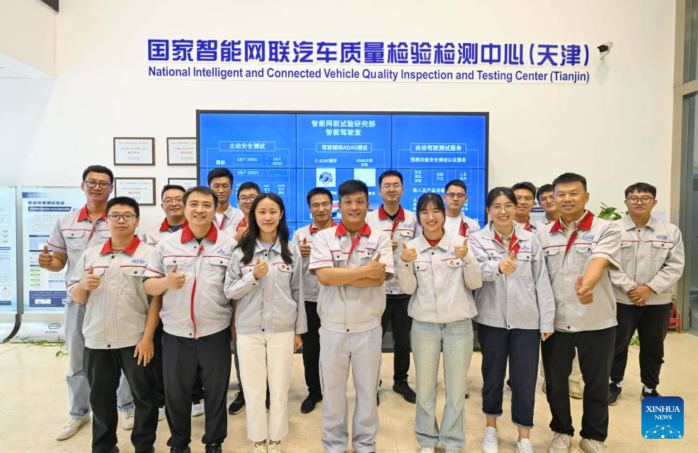 Staff members pose for a group photo at National Intelligent and Connected Vehicle Quality Inspection and Testing Center (Tianjin) in Tianjin, north China, June 19, 2024. Thanks to advances in electrification, networking, and intelligent transformation, along with progress in autonomous driving technologies, self-driving vehicles are gradually becoming a reality. As the industry develops, more professionals are becoming testers of self-driving vehicles. The profession "intelligent connected vehicle tester" was listed as one of 19 new professions by the Ministry of Human Resources and Social Security earlier this year. (Xinhua/Sun Fanyue)