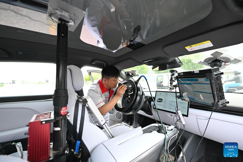 Intelligent connected vehicle tester Zhang Cheng conducts tests in an intelligent connected vehicle at an automobile inspection center in Tianjin, north China, June 19, 2024. Thanks to advances in electrification, networking, and intelligent transformation, along with progress in autonomous driving technologies, self-driving vehicles are gradually becoming a reality. As the industry develops, more professionals are becoming testers of self-driving vehicles. The profession "intelligent connected vehicle tester" was listed as one of 19 new professions by the Ministry of Human Resources and Social Security earlier this year. (Xinhua/Sun Fanyue)