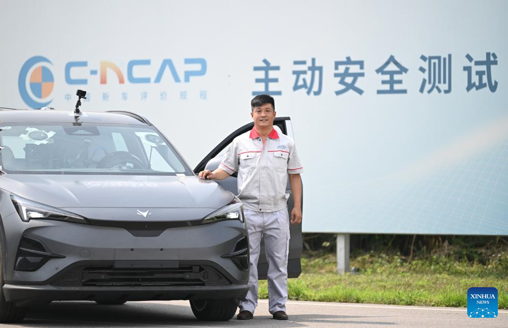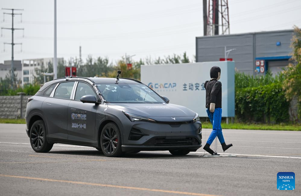 An intelligent connected vehicle conducts autonomous emergency braking test at an enclosed test field in Tianjin, north China, June 19, 2024. Thanks to advances in electrification, networking, and intelligent transformation, along with progress in autonomous driving technologies, self-driving vehicles are gradually becoming a reality. As the industry develops, more professionals are becoming testers of self-driving vehicles. The profession "intelligent connected vehicle tester" was listed as one of 19 new professions by the Ministry of Human Resources and Social Security earlier this year. (Xinhua/Sun Fanyue)