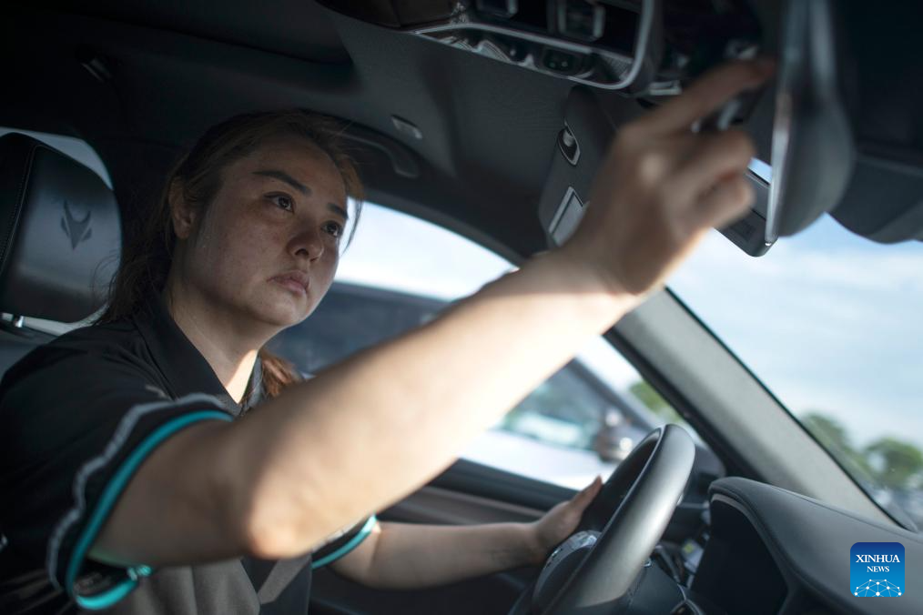 Intelligent connected vehicle tester Wang Juan adjusts a rearview mirror before a road test in Wuhan, central China's Hubei Province, July 4, 2024. Thanks to advances in electrification, networking, and intelligent transformation, along with progress in autonomous driving technologies, self-driving vehicles are gradually becoming a reality. As the industry develops, more professionals are becoming testers of self-driving vehicles. The profession "intelligent connected vehicle tester" was listed as one of 19 new professions by the Ministry of Human Resources and Social Security earlier this year. (Xinhua/Wu Zhizun)