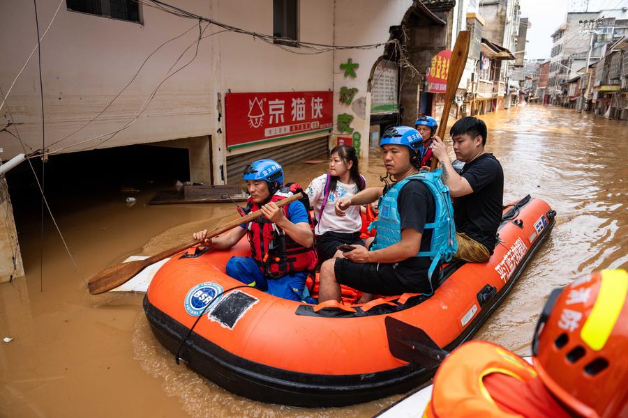 Rescuers transfer stranded residents in Pingjiang county, central China's Hunan Province, July 2, 2024. (Xinhua/Chen Sihan)