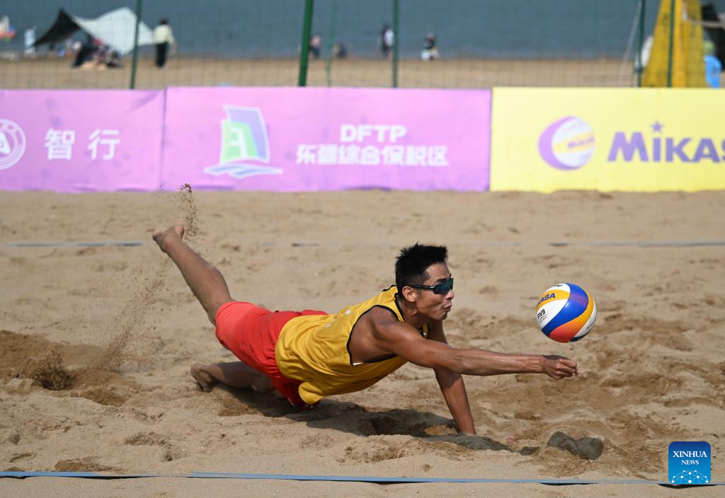 Liu Chuanyong competes during the men's bronze match between Wang Yanwei/Liu Chuanyong of China and Netitorn Muneekul/Wachirawit Muadpha of Thailand at 2024 AVC Beach Tour Tianjin Open in Tianjin, China, on July 14, 2024. (Xinhua/Zhao Zishuo)