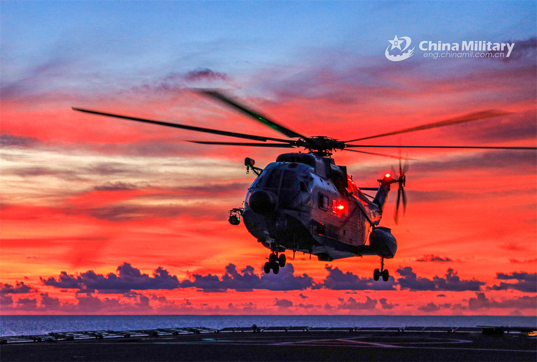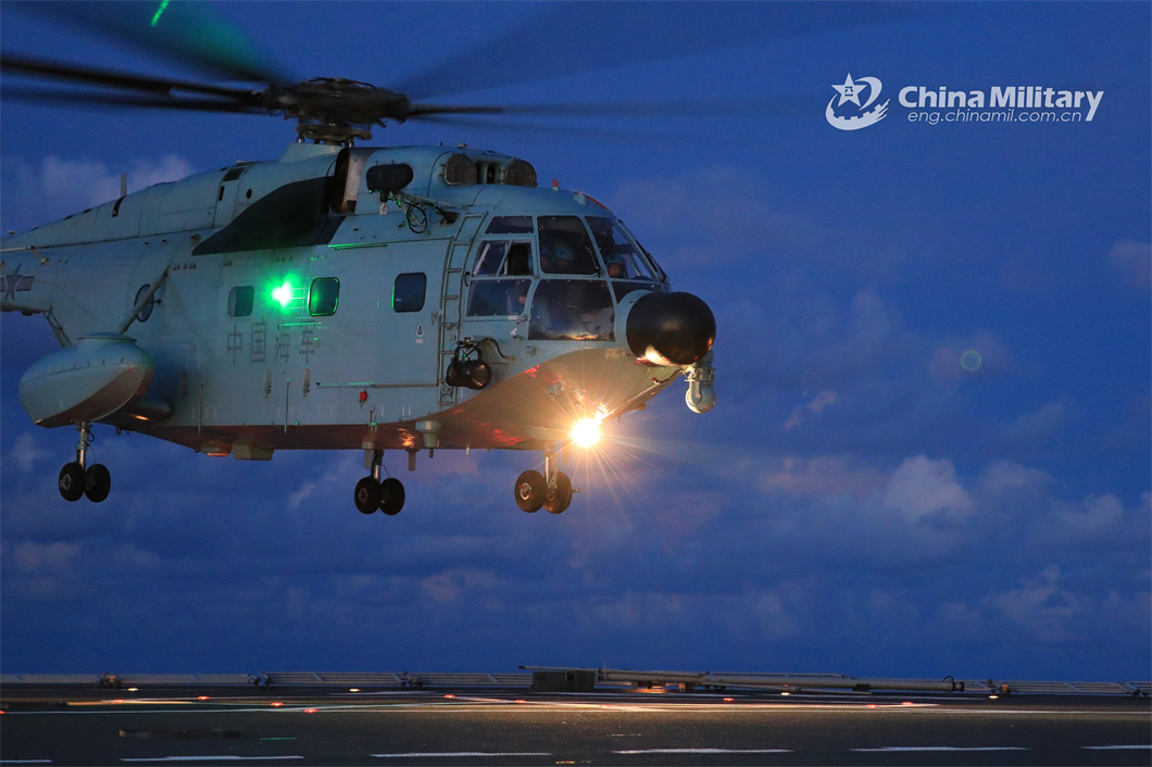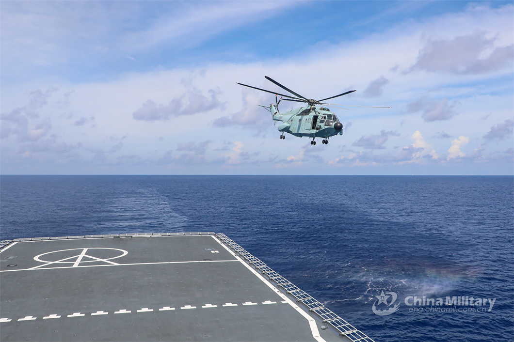 A ship-borne helicopter attached to a naval aviation unit prepares to land on the flight deck of a vessel during a maritime training exercise jointly conducted by the naval aviation unit and a flotilla under the PLA Navy on June 14, 2024. (eng.chinamil.com.cn/Photo by Zou Liyuan)