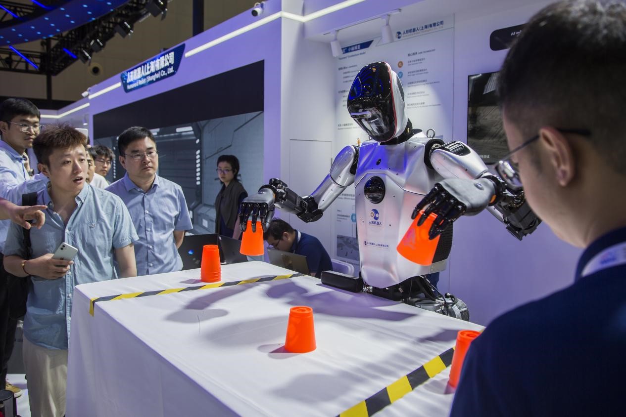 A robot shows its ability at the exhibition booth of Humanoid Robot (Shanghai) Co., Ltd. at the 2024 World AI Conference, east China's Shanghai, July 5, 2024. (People's Daily Online/Xu Kunde)