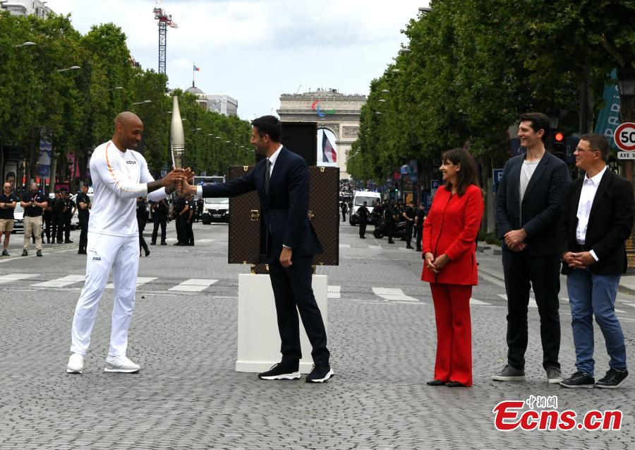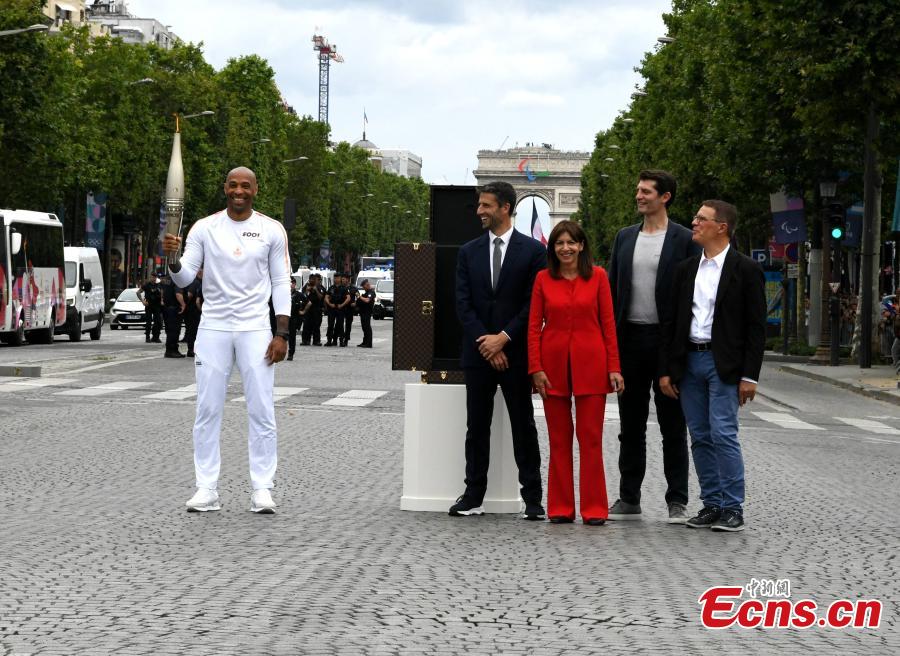 French football Olympics 2024 coach Thierry Henry (1st L) holds the Olympic torch during the Olympic Games Paris 2024 Torch Relay in Paris, France, July 14, 2024. (China News Service/Li Yang)