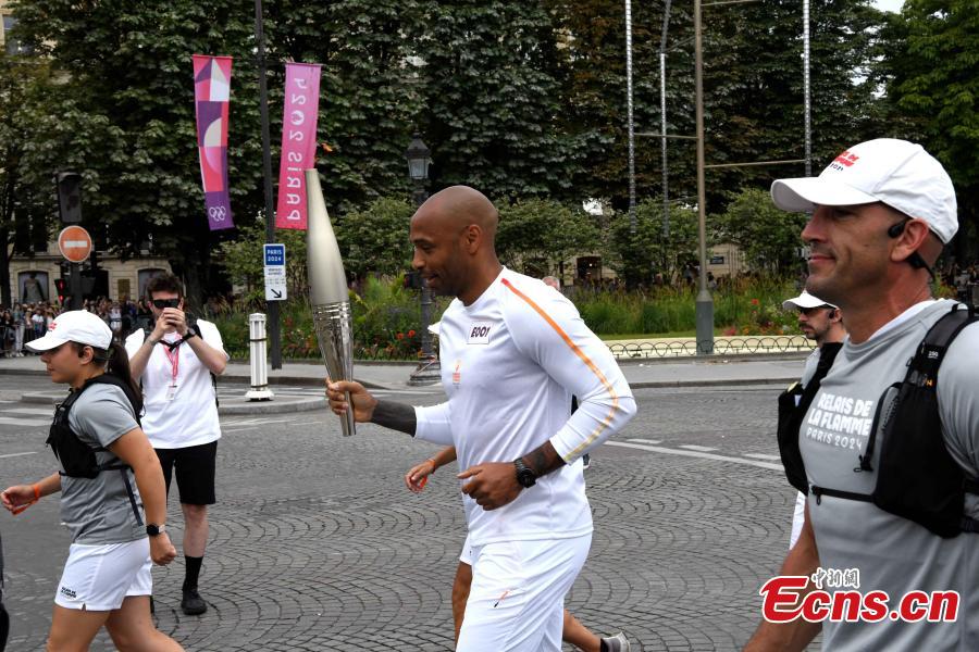 French football Olympics 2024 coach Thierry Henry runs with the Olympic torch during the Olympic Games Paris 2024 Torch Relay in Paris, France, July 14, 2024. (China News Service/Li Yang)