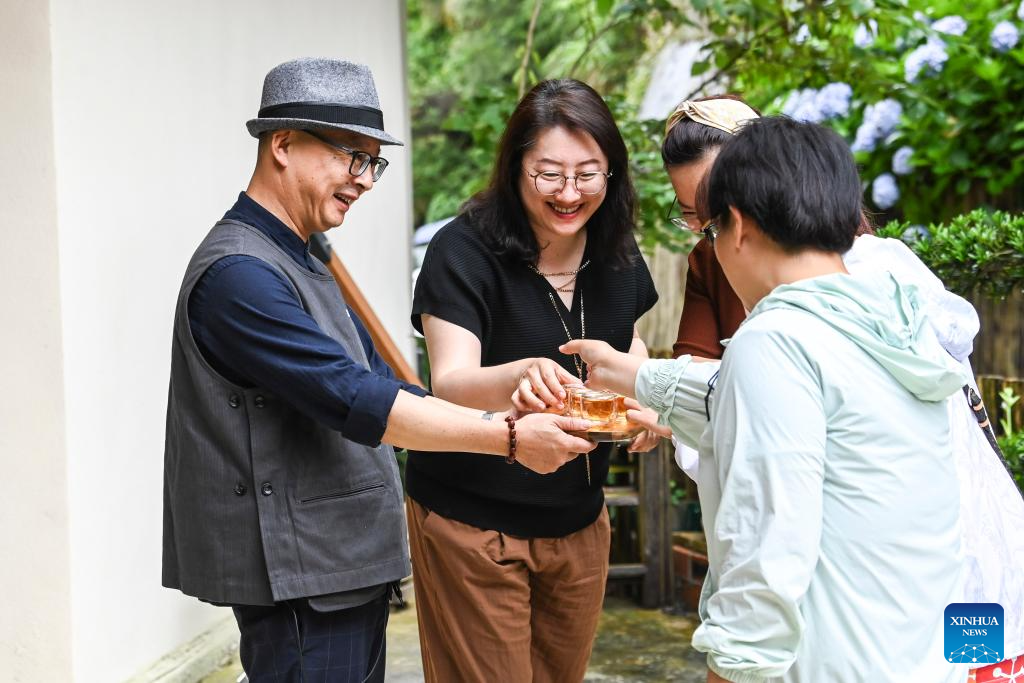 Li Bin (1st L) serves tea to tourists at the homestay he operates at Dazhai Village of Longsheng County, south China's Guangxi Zhuang Autonomous Region, June 26, 2024. (Xinhua/Liu Chan)