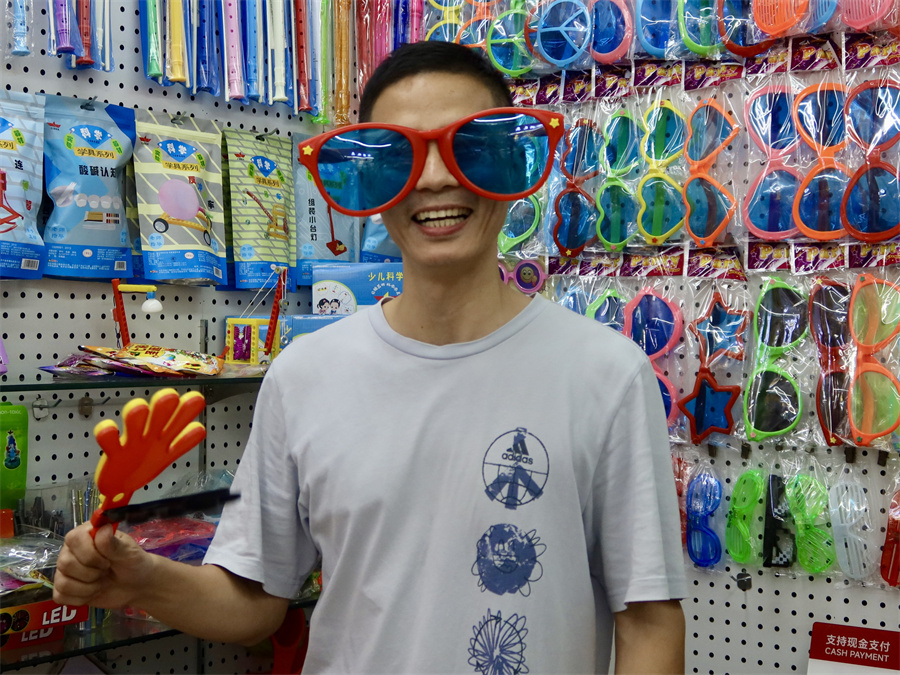 A business owner shows sporting-related products in Yiwu, Zhejiang province, in May. (DONG YIXIN/CHINA NEWS SERVICE)
